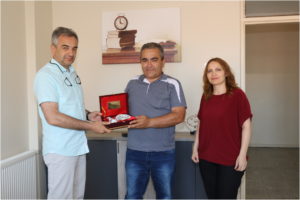 Belediye Başkan Yardımcısı Mehmet Atabay ve İnsan Kaynakları Müdürü Ayşe Ceyhan Düzgün’de Hüseyin Tokmak’a fincan takımı hediye ederek emeklilik hayatında sağlık, huzur temennisinde bulundu.