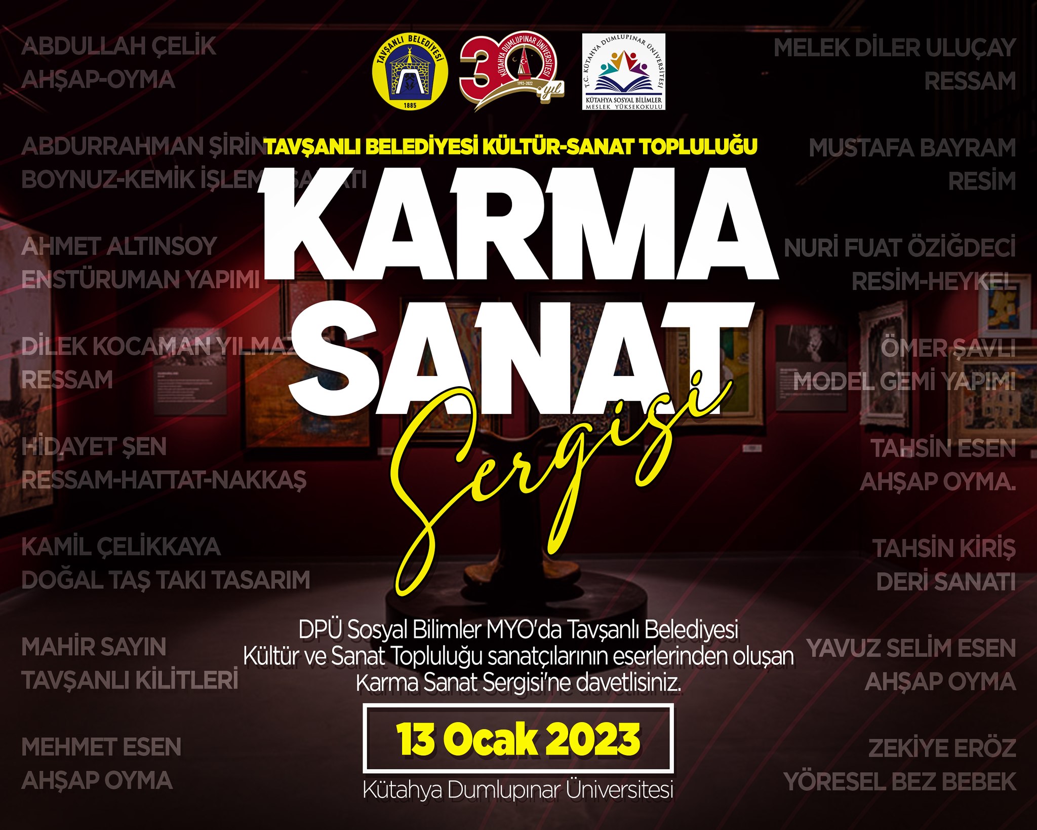 Dumlupınar Üniversitesi Meslek Yüksek Okulları Koordinatörlüğü tarafından Meslek Yüksek Okulları Çalıştayı düzenlenecek. 13 Ocak Cuma günü saat 10:00’da başlayacak çalıştayda Tavşanlılı sanatçılarda Fen Edebiyat Fakültesi Germiyanoğlu Yakup Bey Konferans Salonu’nda stant açarak ürünlerini tanıtacak.