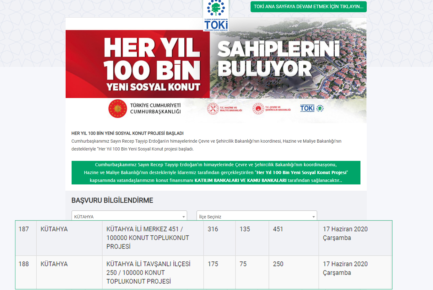 TOKİ’nin resmi internet sitesinden yayınlanan bilgilendirme tablosunda Tavşanlı ilçesine bu proje kapsamında 175 adet 2+1, 75 adette 3+1 konut yapılacağı açıklandı. İhale sürecine ilişkin henüz bir bilgi paylaşımında bulunulmadı.